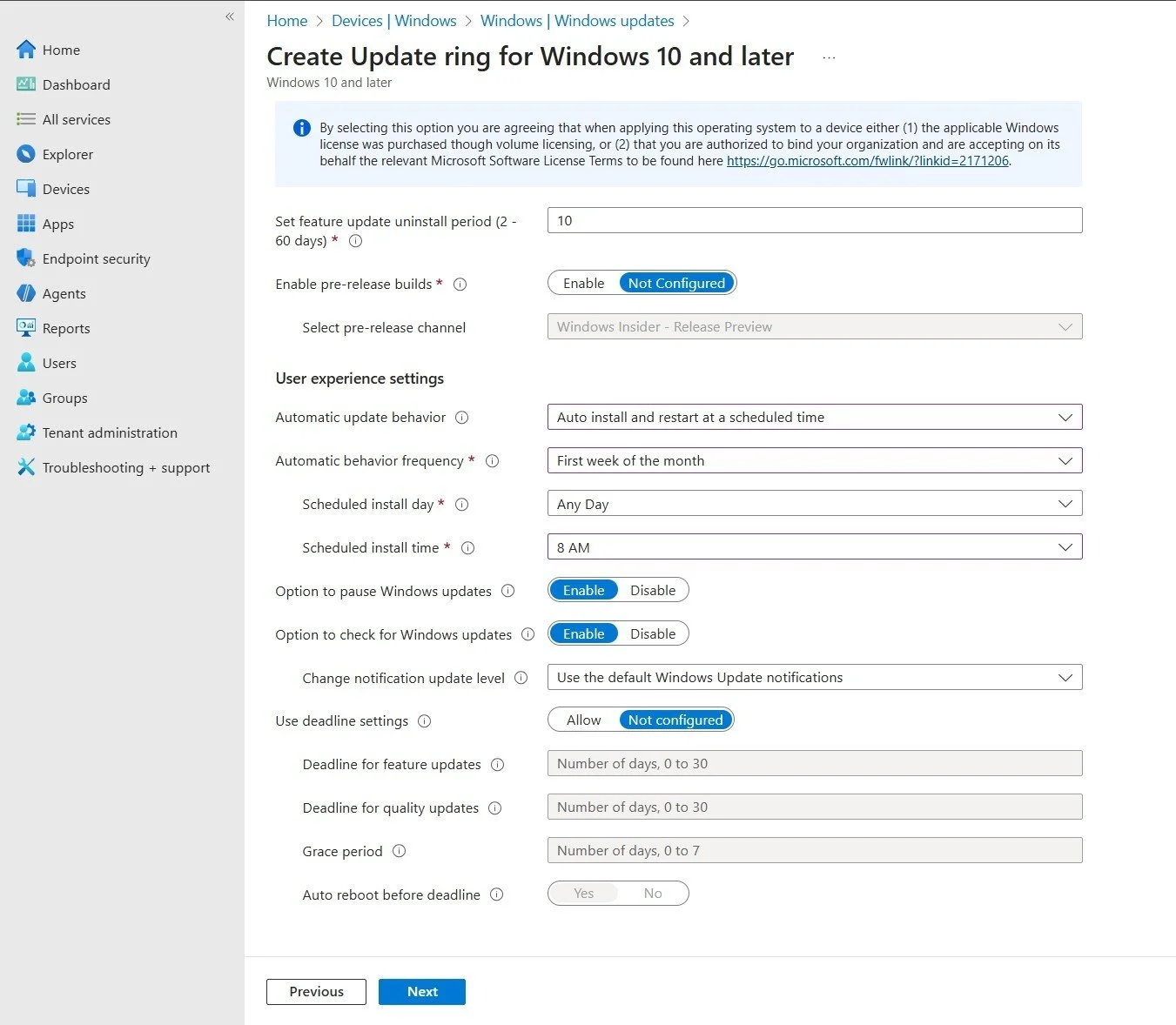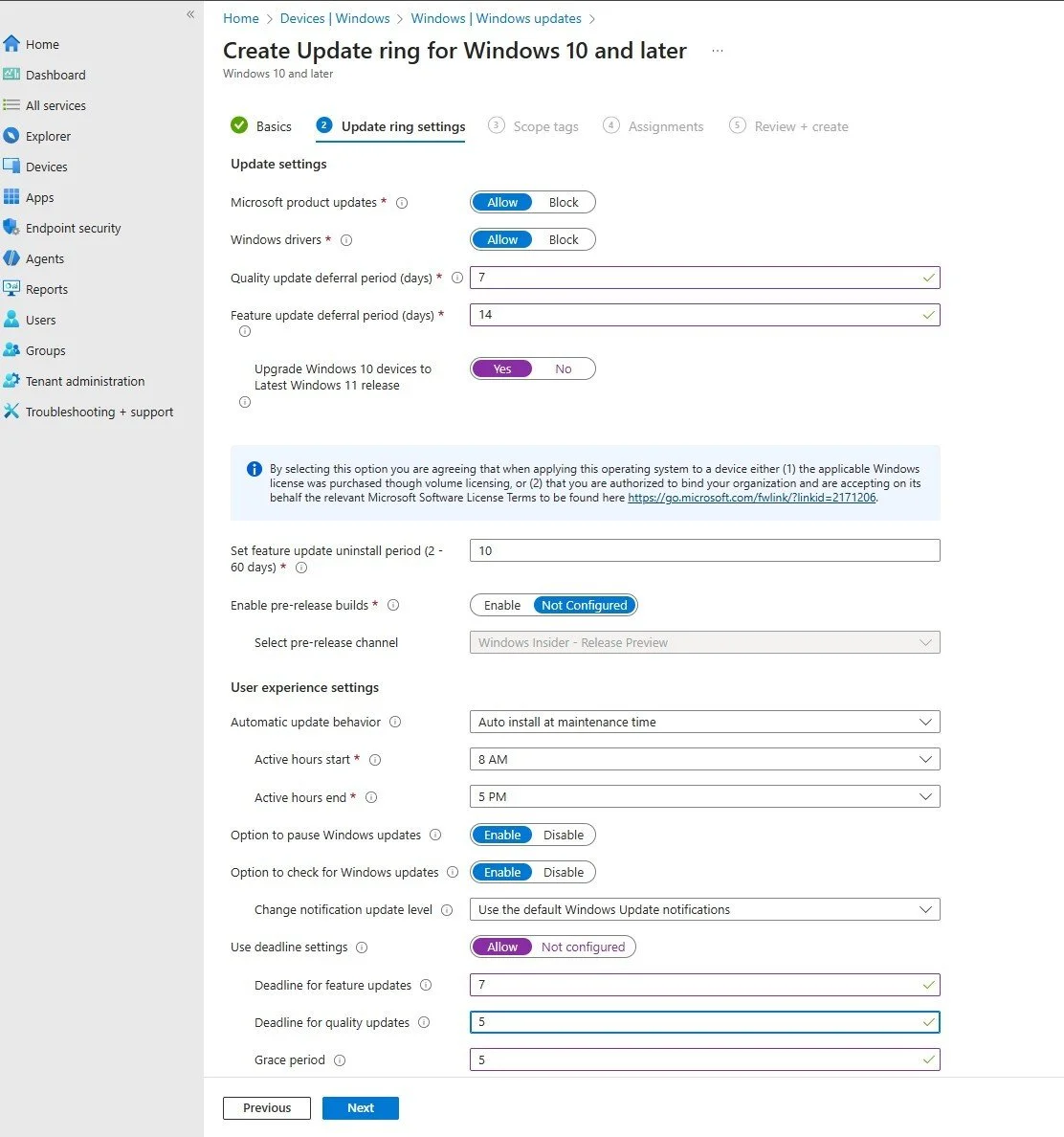 Figure 3: Configuring the update and user experience settings for the IT Pilot ring (Ring 1) with 0-day deferrals.