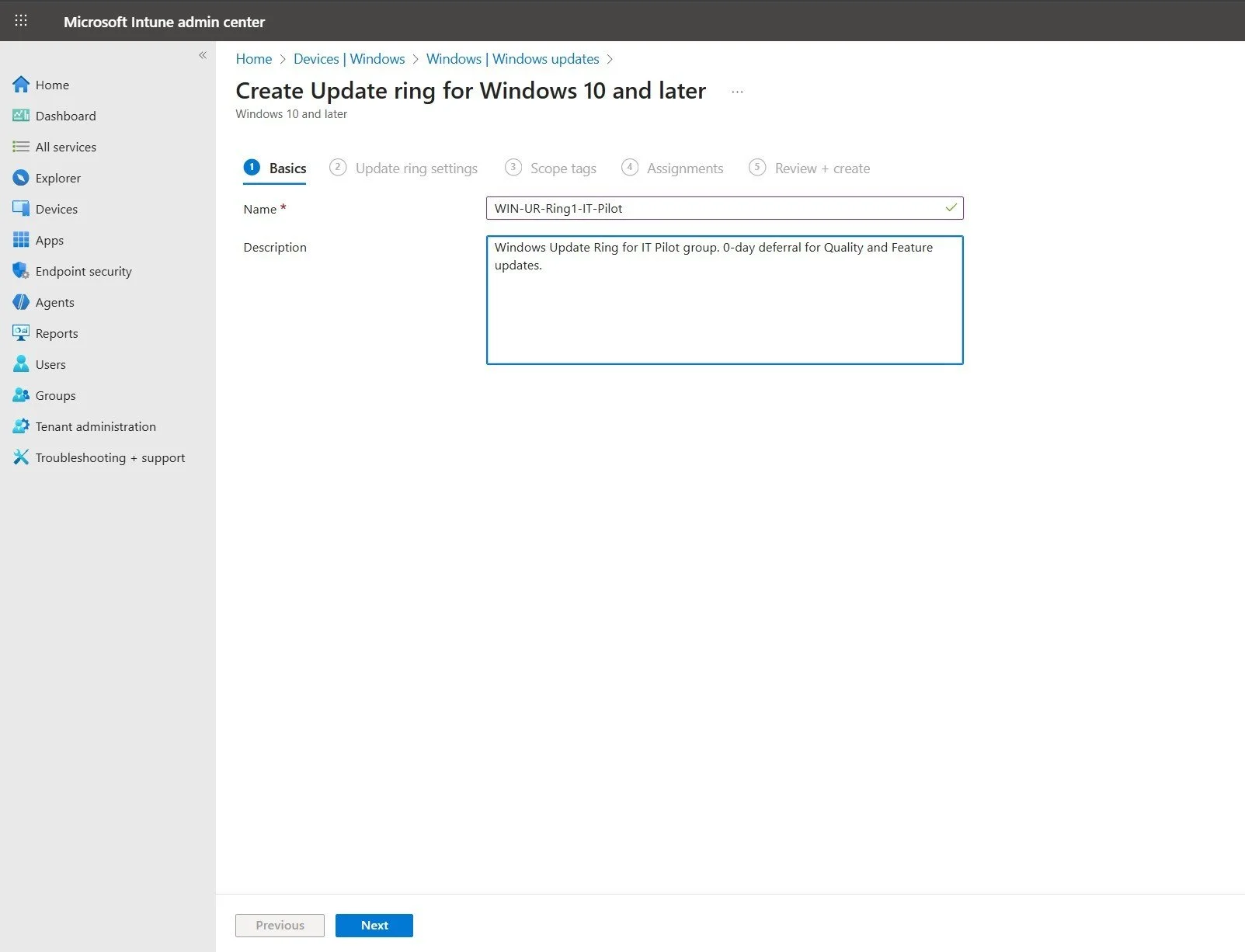 WIN-UR-Ring1-IT-Pilotgroup, and then click Next. - On the Review + create page, verify your settings and click Create.