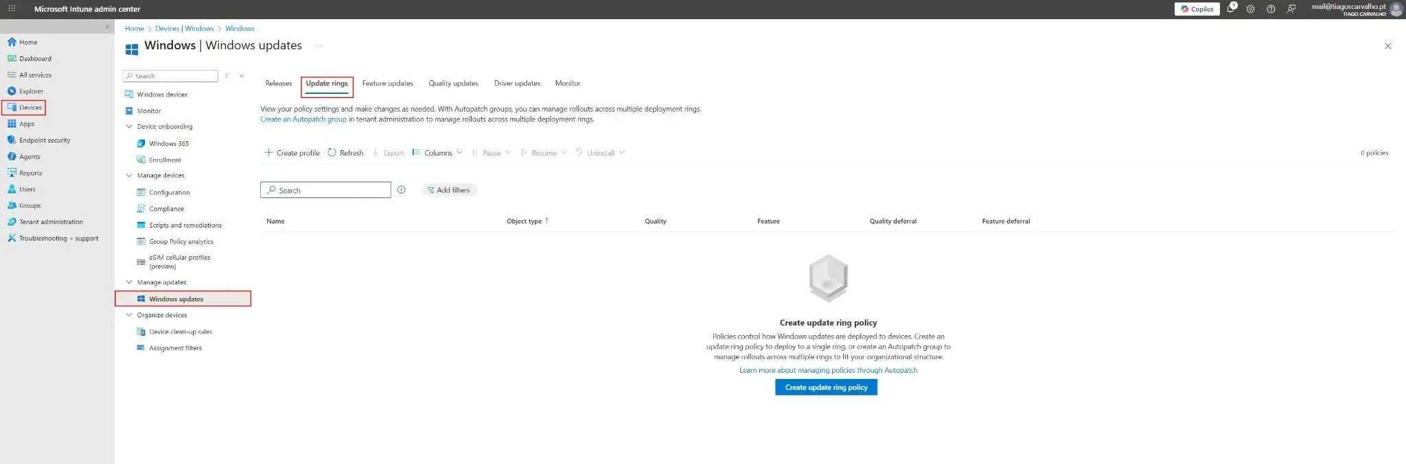 - In the Intune admin center, navigate to Devices > Windows > Windows 10 and later updates > Update rings tab.