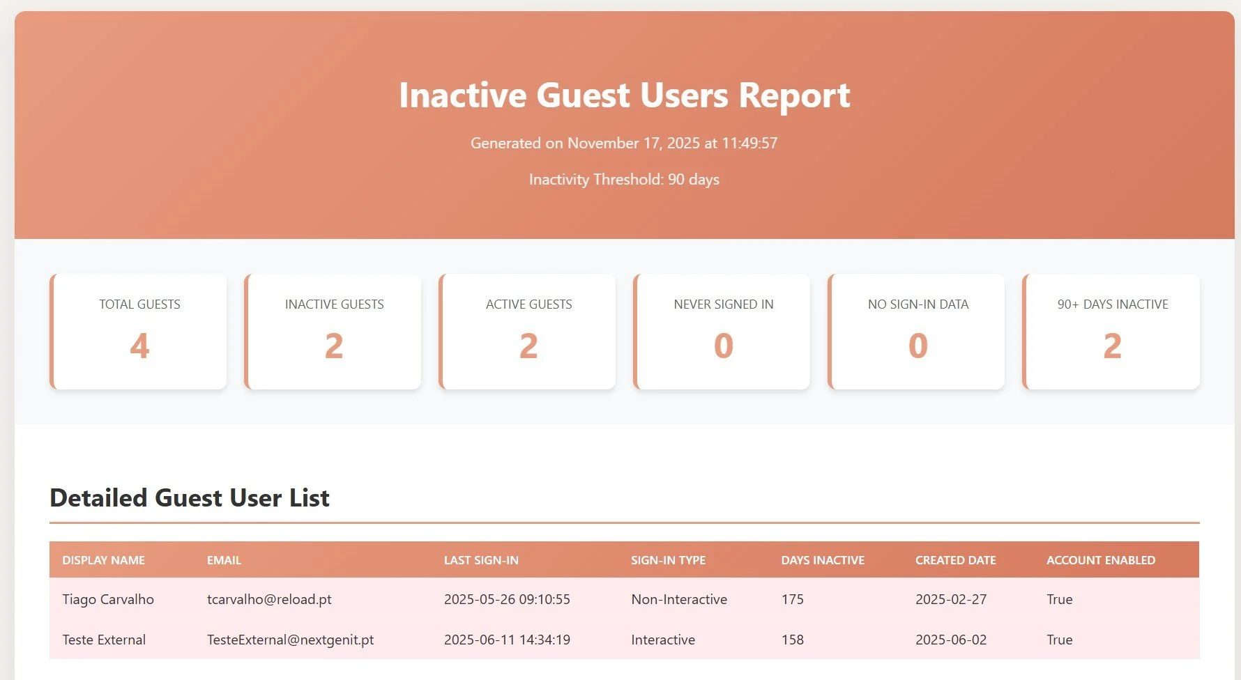 The script generates a professional HTML report with executive summary statistics, activity breakdown, and a color-coded table of inactive guests. This report is perfect for sharing with stakeholders and management.