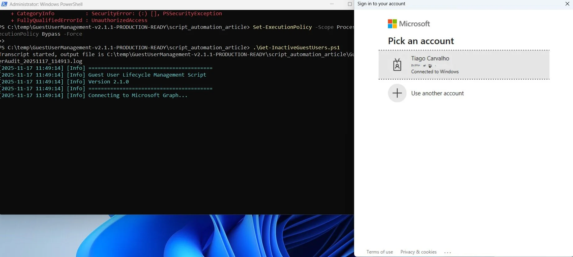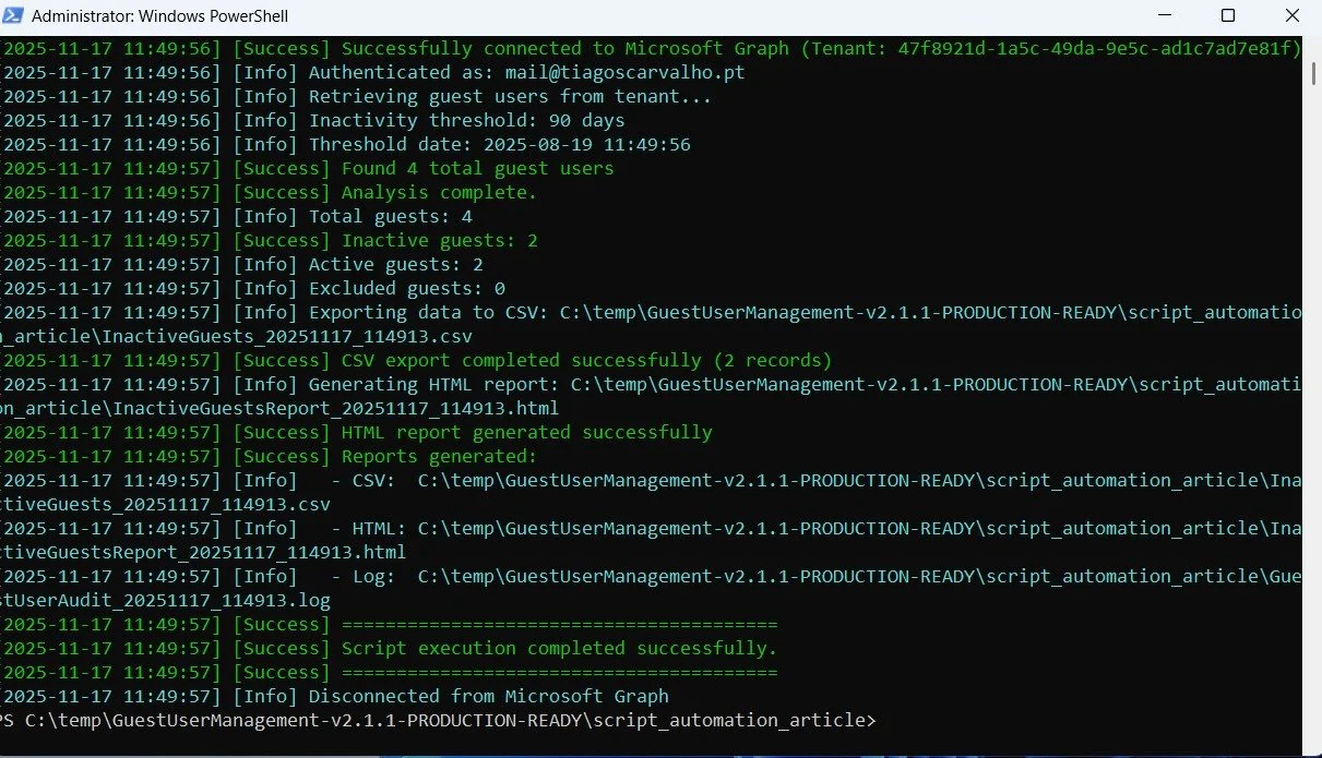The script follows a systematic approach to identify and report on inactive guest users. Here's the complete process with screenshots from a real tenant execution: