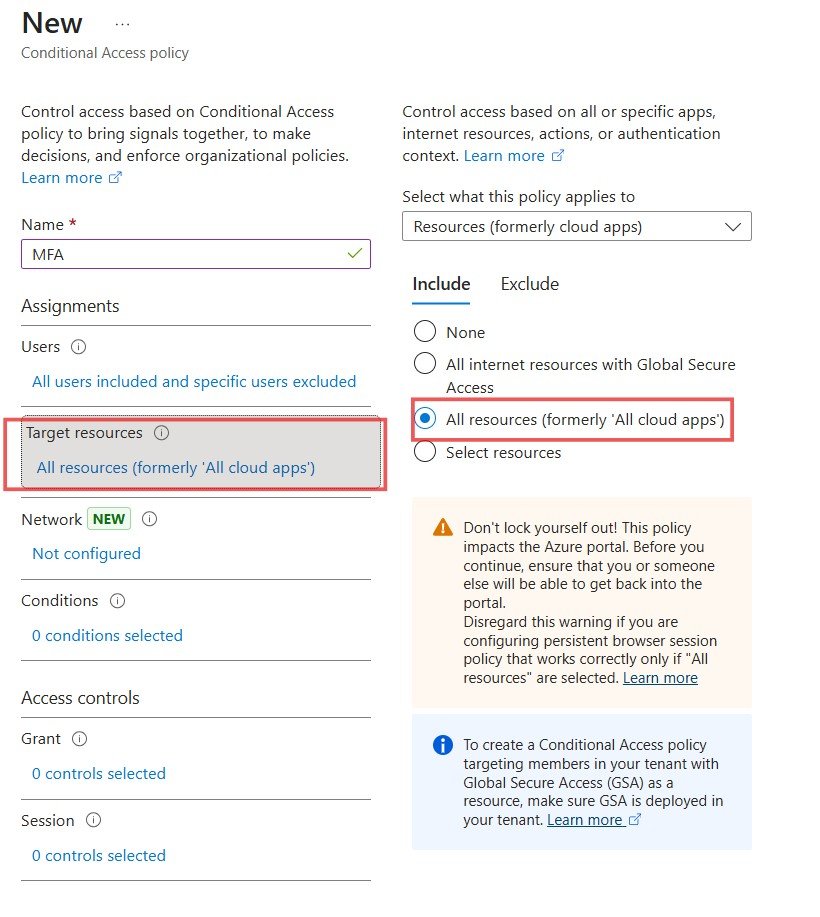 Next, click on Target resources. To apply this policy broadly for maximum security, select All cloud apps under the "Include" tab. This ensures that any sign-in to any application integrated with Microsoft Entra ID will be protected by MFA.
