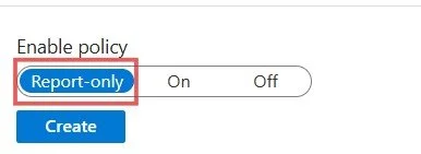 Before enforcing the policy, it is crucial to test its impact. At the bottom of the blade, under Enable policy, set the toggle to Report-only. This allows you to monitor the policy's effects in the sign-in logs without actually enforcing it on users. It provides a safe way to validate that the policy behaves as expected.