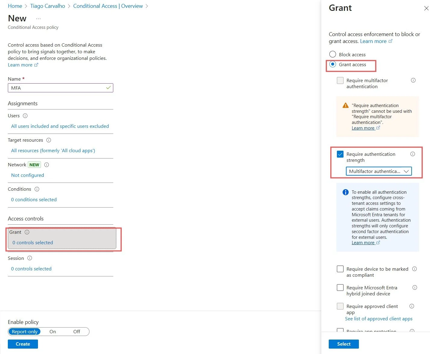 Figure 5: Requiring 'Multifactor authentication' strength as the grant control.