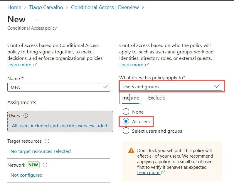 Under Assignments, click on Users. Select All users under the "Include" tab. It is critical to exclude your emergency access accounts to prevent being locked out.